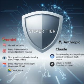 The Silver Tier is shared by Gemini and Claude. Google’s AI assistant, Gemini, uses the Gemini 3 models and offers a “Deep Think mode” for detailed, step-by-step problem-solving. Gemini is also known for strong multimodal understanding across text, images, and video, and features deep integration across Google Workspace apps like Gmail and Drive.